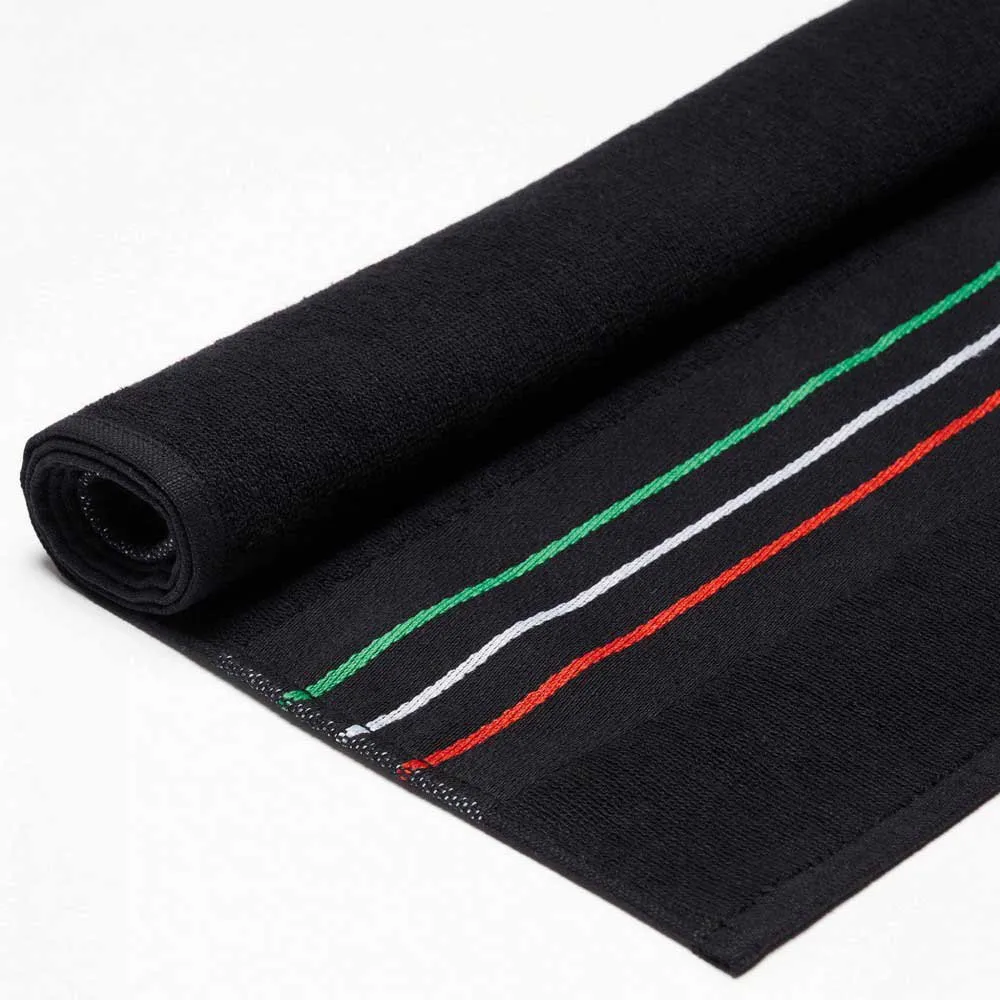 Terry towel suitable during workouts at the gym or as a ring towel during com-petition. Available in black color with Italian flag and Leone 1947 logo.